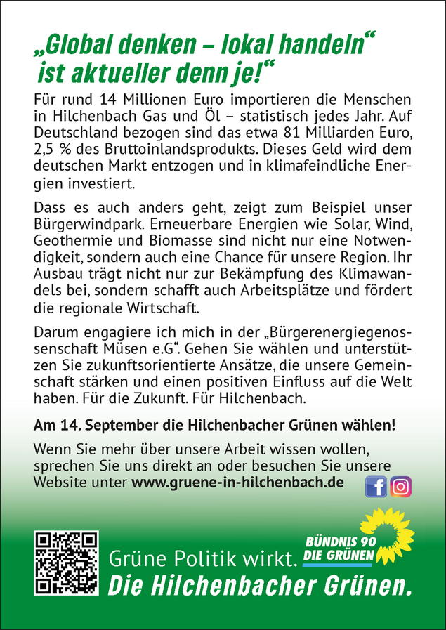 „Viele kleine Leute an vielen kleinen Orten können das Gesicht der Welt verändern“ heißt es in einem afrikanischen Sprichwort. Das gilt auch Hilchenbach, darum lasst uns gemeinsam lokale Lösungen für globale Herausforderungen entwickeln.