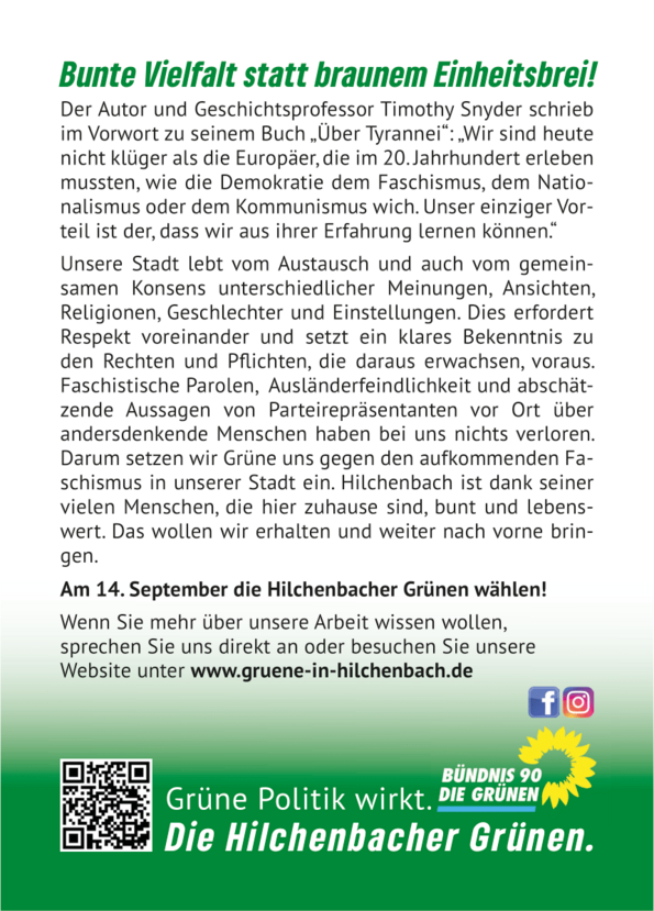 Seitdem sich in Hilchenbach eine rechtsradikale Partei ansiedelte, arbeite ich im „Hilchenbacher Bündnis für Toleranz und Zivilcourage“ mit. Wegschauen ist für mich keine Option, das ging schon einmal schief und wie der amerikanische Historiker Timothy Synder so treffend sagte „Wir dürfen aus den Erfahrungen unserer Vorfahren lernen“.